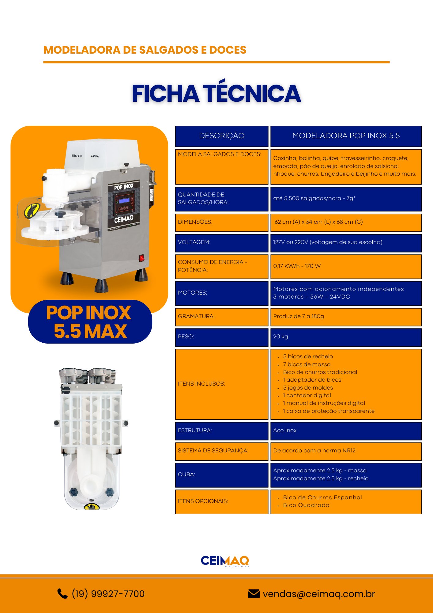 Com a capacidade de produzir até 5.500 salgados por hora, essa máquina de alta performance é feita em aço inoxidável de qualidade superior, garantindo durabilidade e eficiência desde o primeiro dia de uso